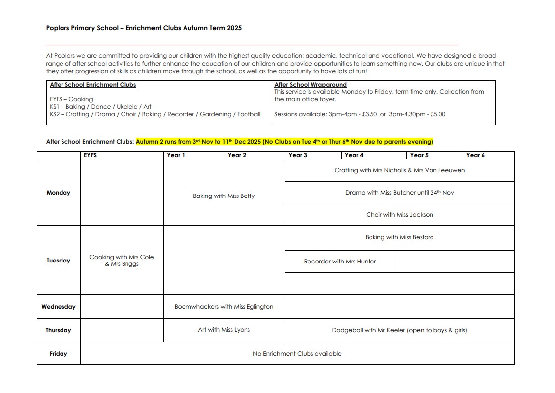 Poplars Enrichment Clubs Autumn 2 Term 2025